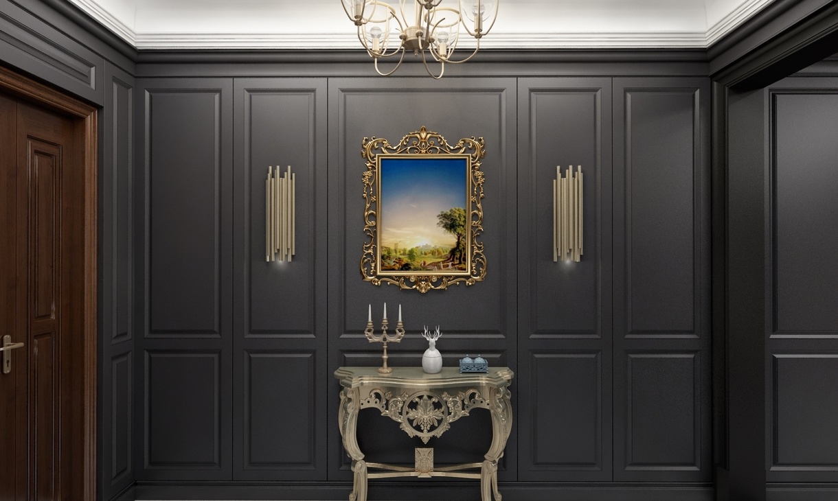 黃銅壁燈、掛畫,一進(jìn)門就是典型的美式風(fēng)格。映入眼簾的紳士灰護(hù)墻板讓人進(jìn)入一種深思,但又想進(jìn)步觀賞。