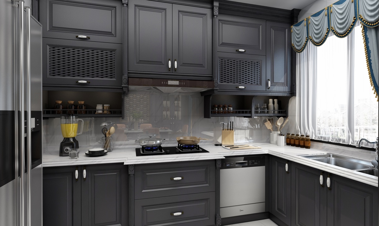 網(wǎng)格門、調(diào)味架、羅馬柱,美式廚房的“三劍客”,高級灰的門板加上雪白的臺面,一種層次感油然而生。