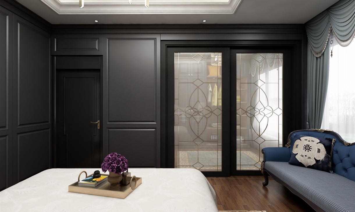 鎏金的美式大床,傳遞著沉穩(wěn)的氣息。配上一張舒適的沙發(fā),整個空間暗藏著主人的情懷在里面,別具匠心。舍棄一間臥室改造成的主臥獨(dú)立衣帽間,更是顯得營造了一種低調(diào)的奢華。
