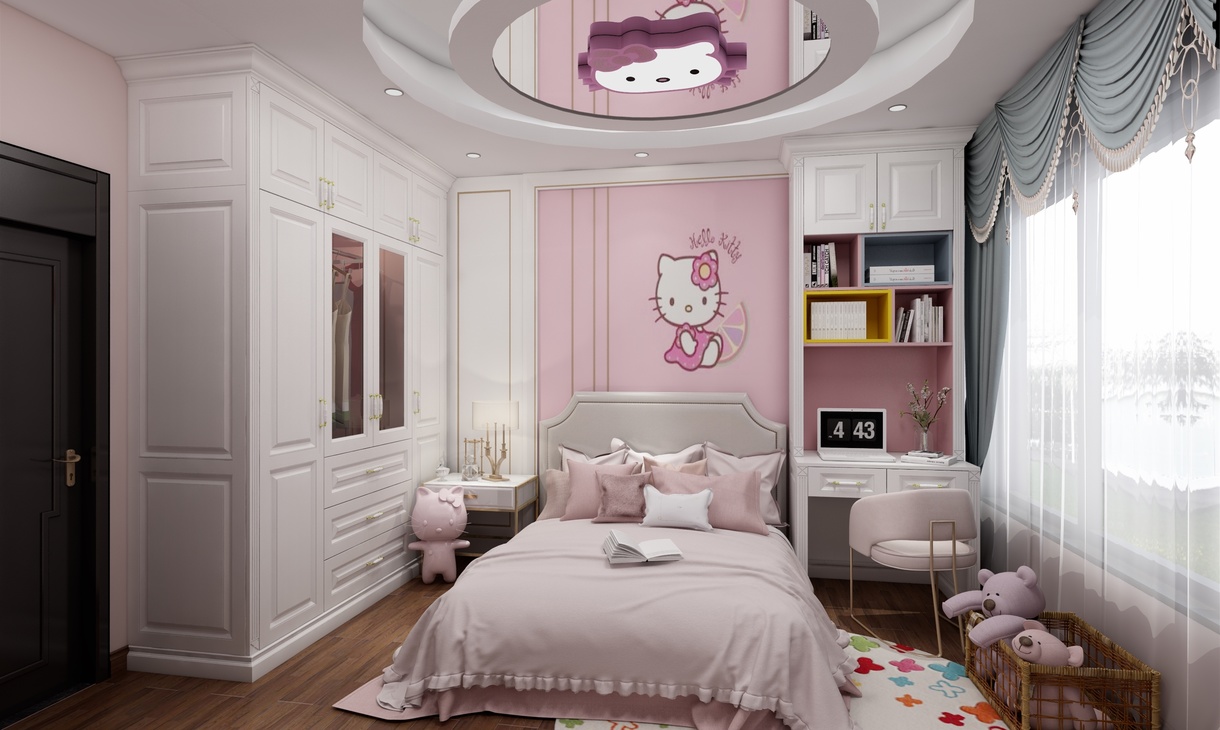 據(jù)說,每個女孩都有一個Hello kitty的夢,設(shè)計(jì)師更是讓這一點(diǎn)發(fā)揮的淋漓盡致,鏡面吊頂使得整個房間的視覺感觀更上一層。