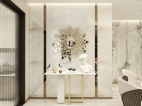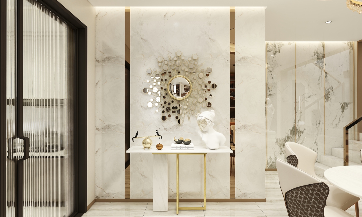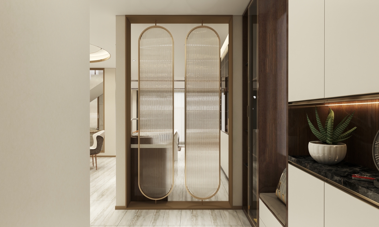 入戶鞋柜處處去掉了原始的窗洞,玄關(guān)隔斷等手法,采用了藝術(shù)玻璃的弧形屏風(fēng),不僅凸顯輕奢風(fēng)格高雅的韻味,也不會(huì)造成空間的擁擠。完整采光的同時(shí),也達(dá)到了劃分空間的效果。入廳后則是玄關(guān)臺(tái)的布局,通過(guò)大理石,鈦金的材質(zhì),來(lái)體現(xiàn)輕奢風(fēng)格的大氣高貴的質(zhì)感,反燈槽線性燈的運(yùn)用,輕奢風(fēng)的掛飾,雕塑則賦予空間更強(qiáng)的高級(jí)感。