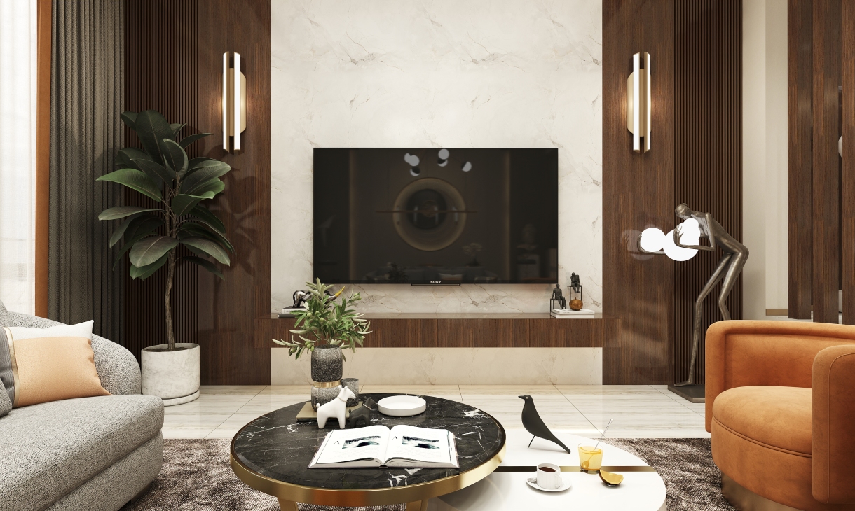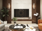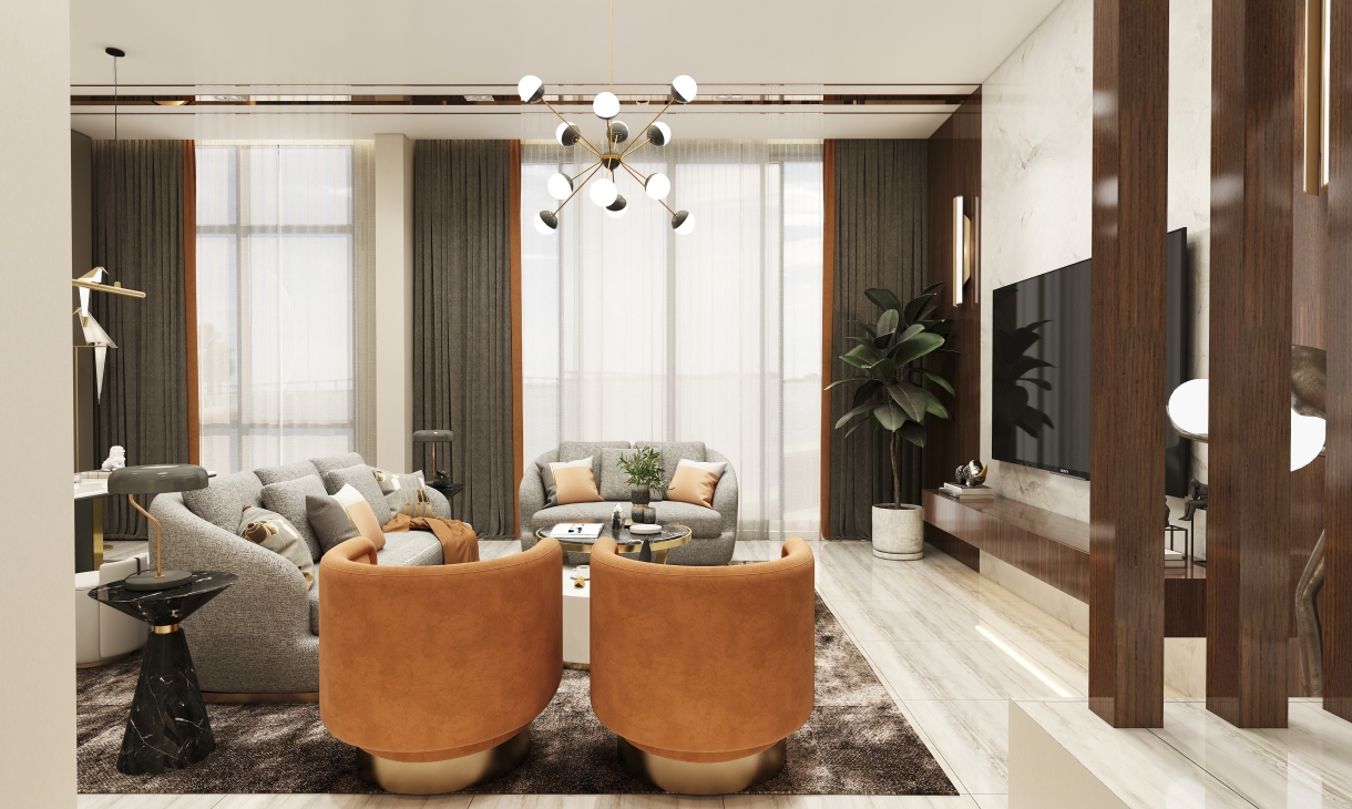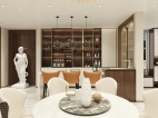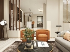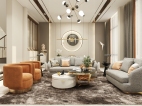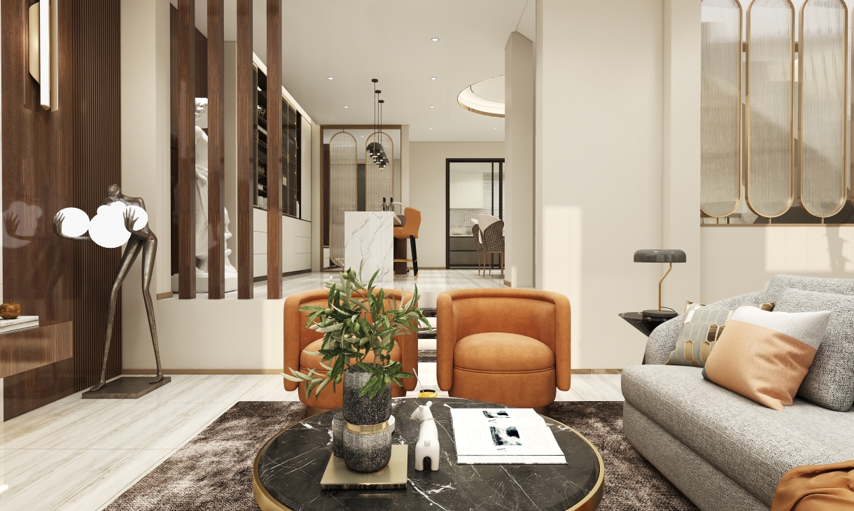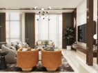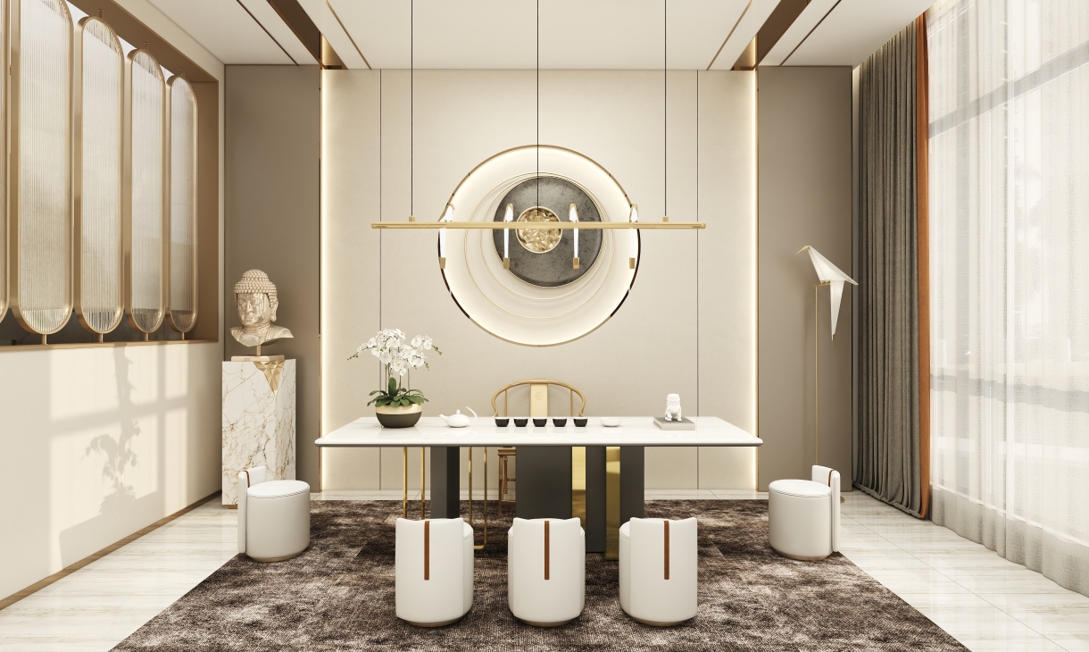 整個(gè)客廳是一個(gè)較大的空間,所以也植入了休閑的生活方式,業(yè)主有品茶的習(xí)慣,所以也設(shè)立了茶室區(qū),體現(xiàn)更為完整的生活方式。同樣是以大理石,木飾面,鈦金線條為裝飾元素,選用了輕奢風(fēng)優(yōu)雅舒適的布藝沙發(fā),子母茶幾,體現(xiàn)時(shí)尚的居家品質(zhì)。絨面橙色單椅,雙拼橙色窗簾的點(diǎn)綴,則恰好的體現(xiàn)了"愛(ài)馬仕橙"的主題色彩。橙色,國(guó)際時(shí)尚的代表色彩,象征著榮譽(yù),希望,健康溫馨,是居家場(chǎng)景及輕奢風(fēng)的不二之選。茶室區(qū)則采用了輕奢中式的設(shè)計(jì)理念,能更好的融入整體的現(xiàn)代輕奢主題。