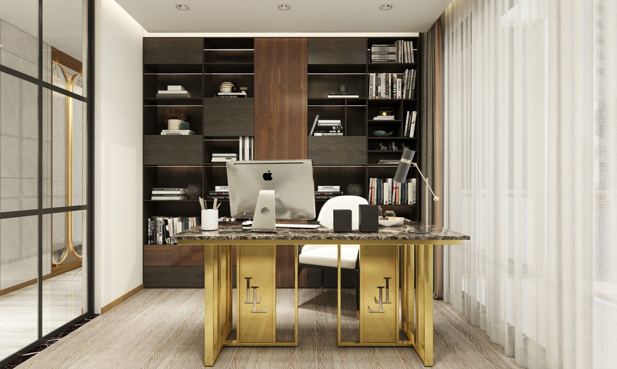 書(shū)房則采用了更為簡(jiǎn)潔的現(xiàn)代風(fēng)格理念,半方式的書(shū)柜設(shè)計(jì),收納陳設(shè)兩不誤。平頂無(wú)主燈,AB墻面,墻紙?jiān)O(shè)計(jì),體現(xiàn)了空間的層次感,也不會(huì)過(guò)于壓抑。無(wú)需過(guò)多的修飾,精致時(shí)尚的軟裝產(chǎn)品,既滿足了功能需求,也是最佳的輕奢元素。