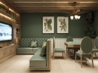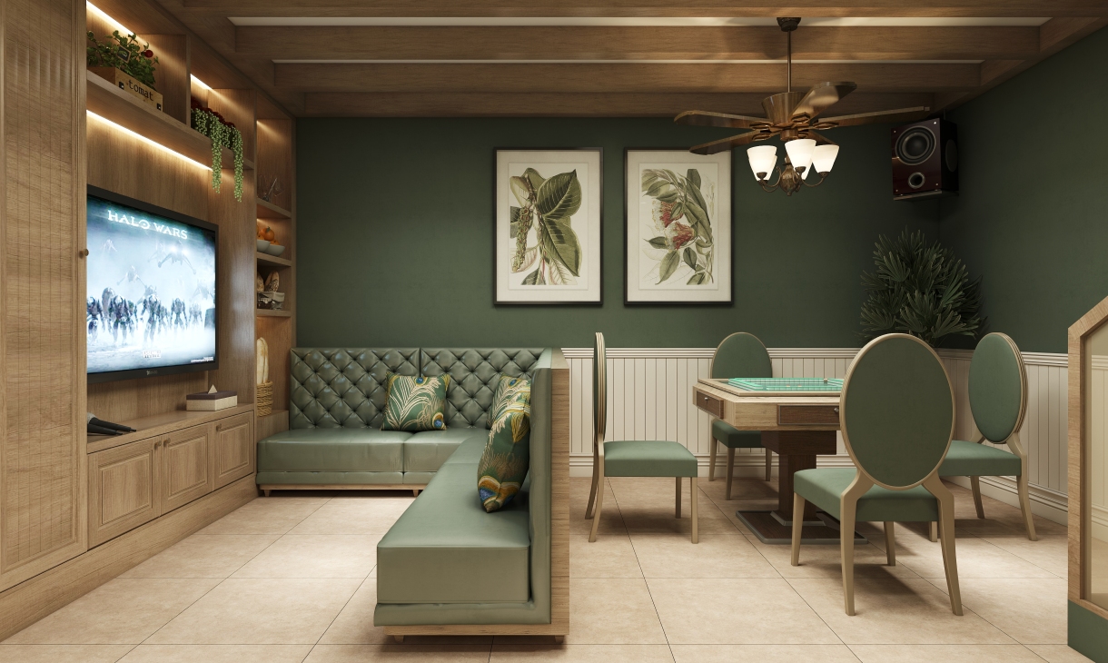 負(fù)一層活動(dòng)室為較為重要的家庭休閑互動(dòng)空間。考慮到審美疲勞及休閑場(chǎng)景的定義,故采用了美式田園風(fēng)格,大量復(fù)古金橡的柜體材質(zhì)及格柵式吊頂,搭配墨綠色的主題色彩。更好的體現(xiàn)空間休憩娛樂(lè)的氛圍。