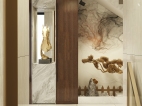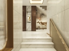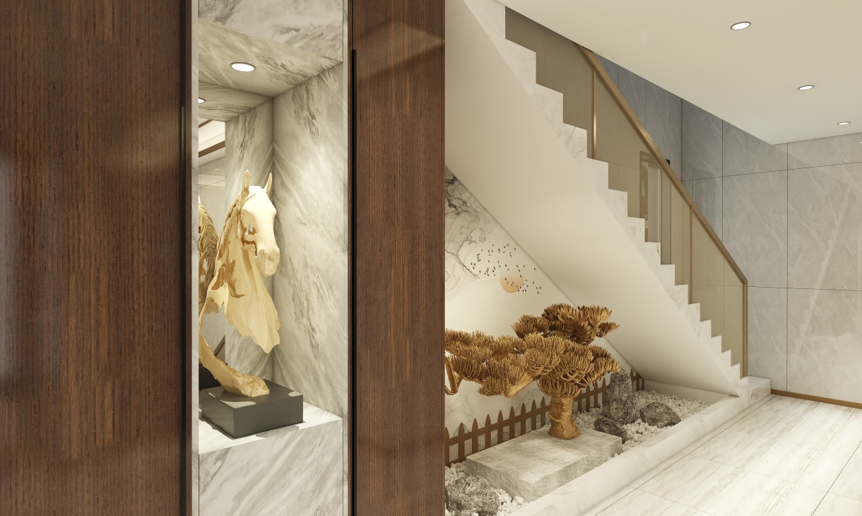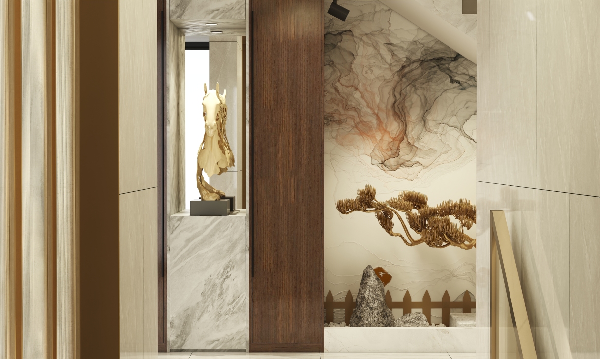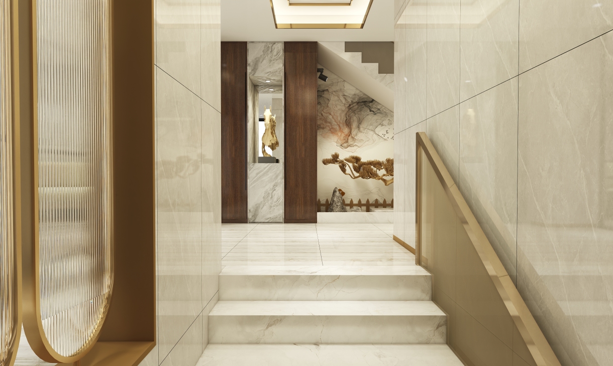 樓梯間為較為重要的公共空間過(guò)道,空間較為狹窄,故采用了主題的定制柜體包梁柱,避其鋒芒,布置了一個(gè)簡(jiǎn)單大氣的中式小景,也融入了現(xiàn)代風(fēng)格的藝術(shù)手法,打造一個(gè)端莊頗具禪意的公共藝術(shù)空間。