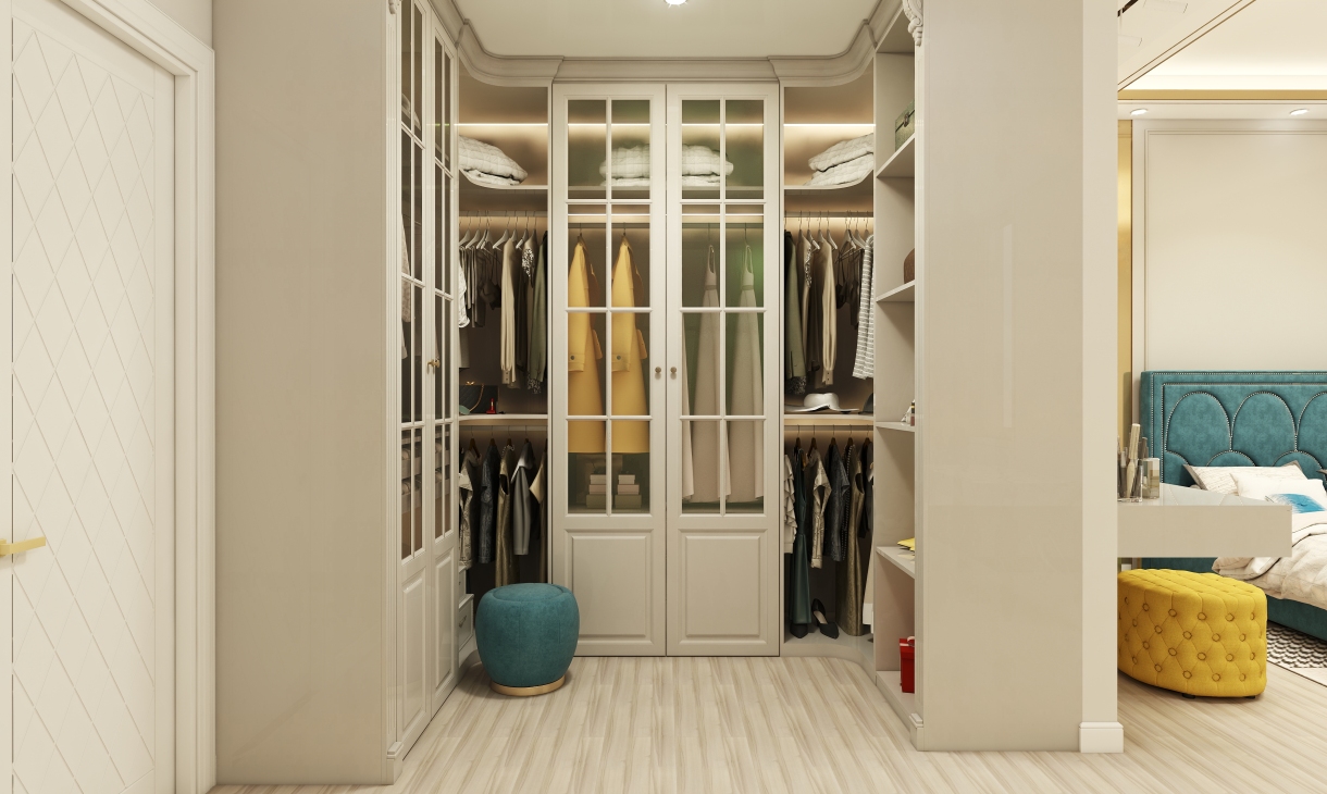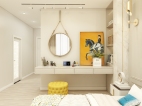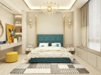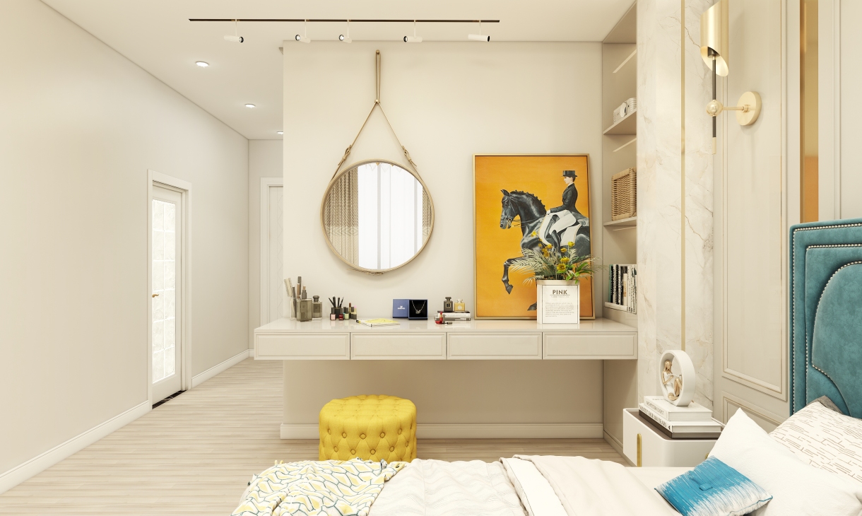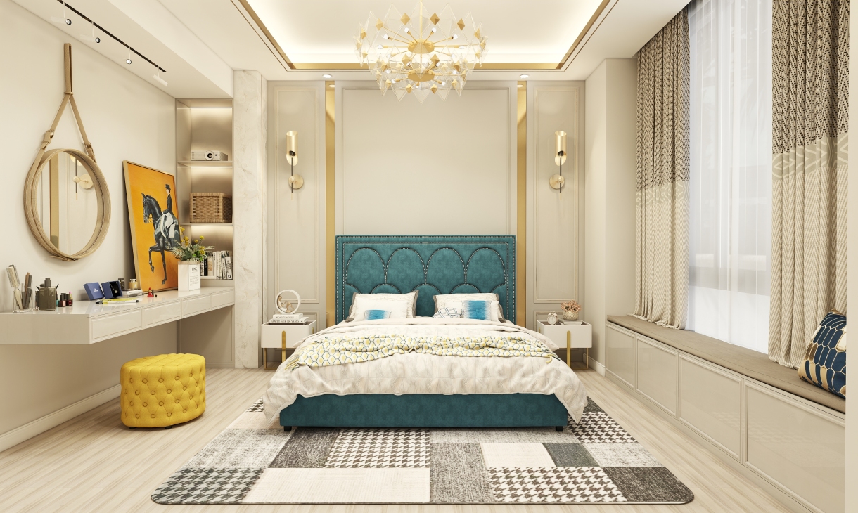 女孩房主人公則喜好顏色更為跳躍大膽的居室氛圍。雖同樣是輕奢風(fēng),女孩房的色彩運(yùn)用則更為大膽強(qiáng)烈,以藍(lán)色,黃色,橘色為碰撞,營(yíng)造更為時(shí)尚且極具少女的氣息。