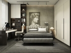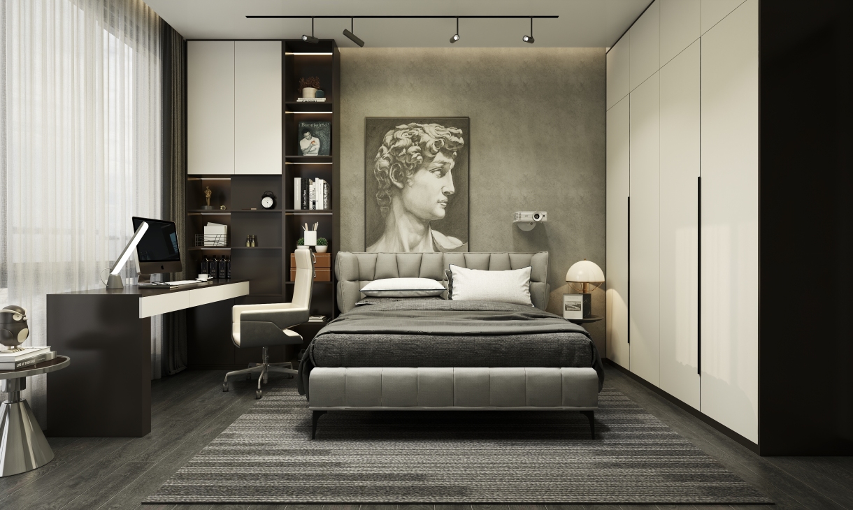 男孩房主人公喜好黑白灰的藝術(shù)格調(diào)。遵循“簡(jiǎn)約而不簡(jiǎn)單”的設(shè)計(jì)理念,吊頂采用了軌道射燈,線性燈槽的設(shè)計(jì)手法,增強(qiáng)空間的線條感,藝術(shù)水泥墻處理,頗具工業(yè)氣息。在。所有軟裝產(chǎn)品都以簡(jiǎn)約,黑灰為主,柜體則集合白色門(mén)板的留白處理。體現(xiàn)極簡(jiǎn)格調(diào)的同時(shí),也不會(huì)過(guò)于壓抑。