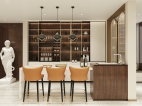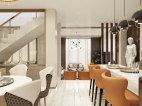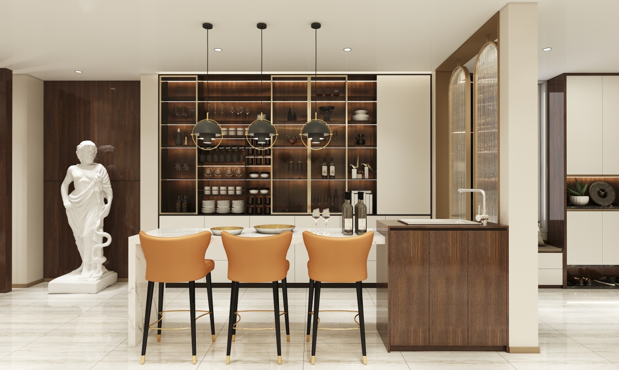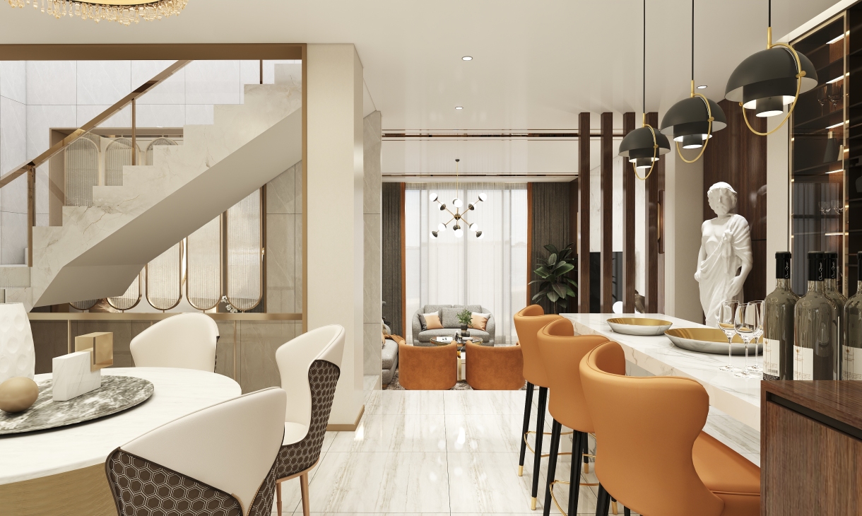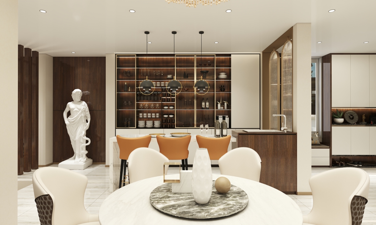 為了滿足生活功能的多樣性,餐廳空間設(shè)立了吧臺(tái)區(qū),餐臺(tái)區(qū),整體開(kāi)放式的布局,體現(xiàn)了現(xiàn)代人無(wú)拘無(wú)束的生活方式,空間也更為開(kāi)闊。輕奢風(fēng)的家具,與咖色復(fù)古柜體材質(zhì)的碰撞,賦予了空間別具一格的高級(jí)感。西式落地雕塑則是場(chǎng)景的點(diǎn)睛之筆,橙色的吧椅,則是空間的主題色彩,也是貫穿客餐廳的線索。