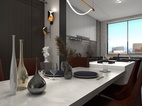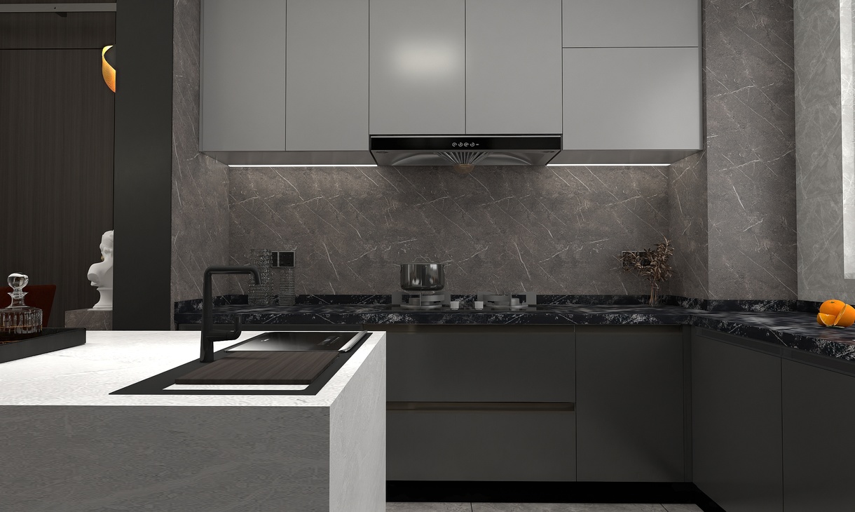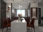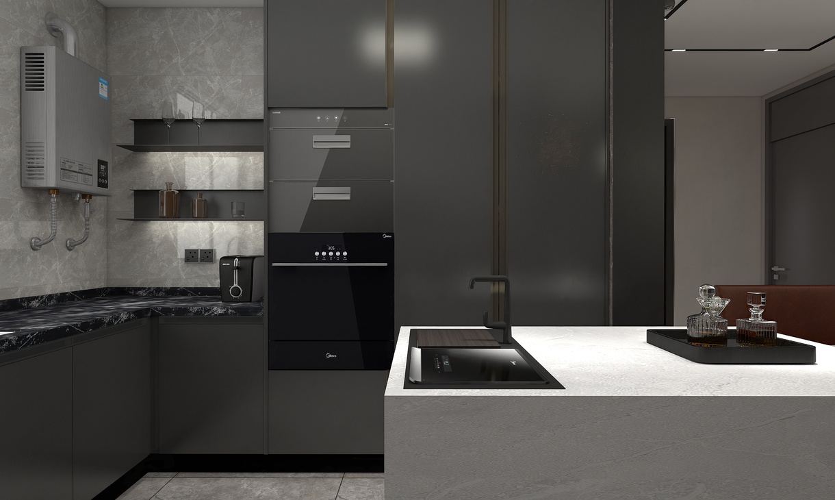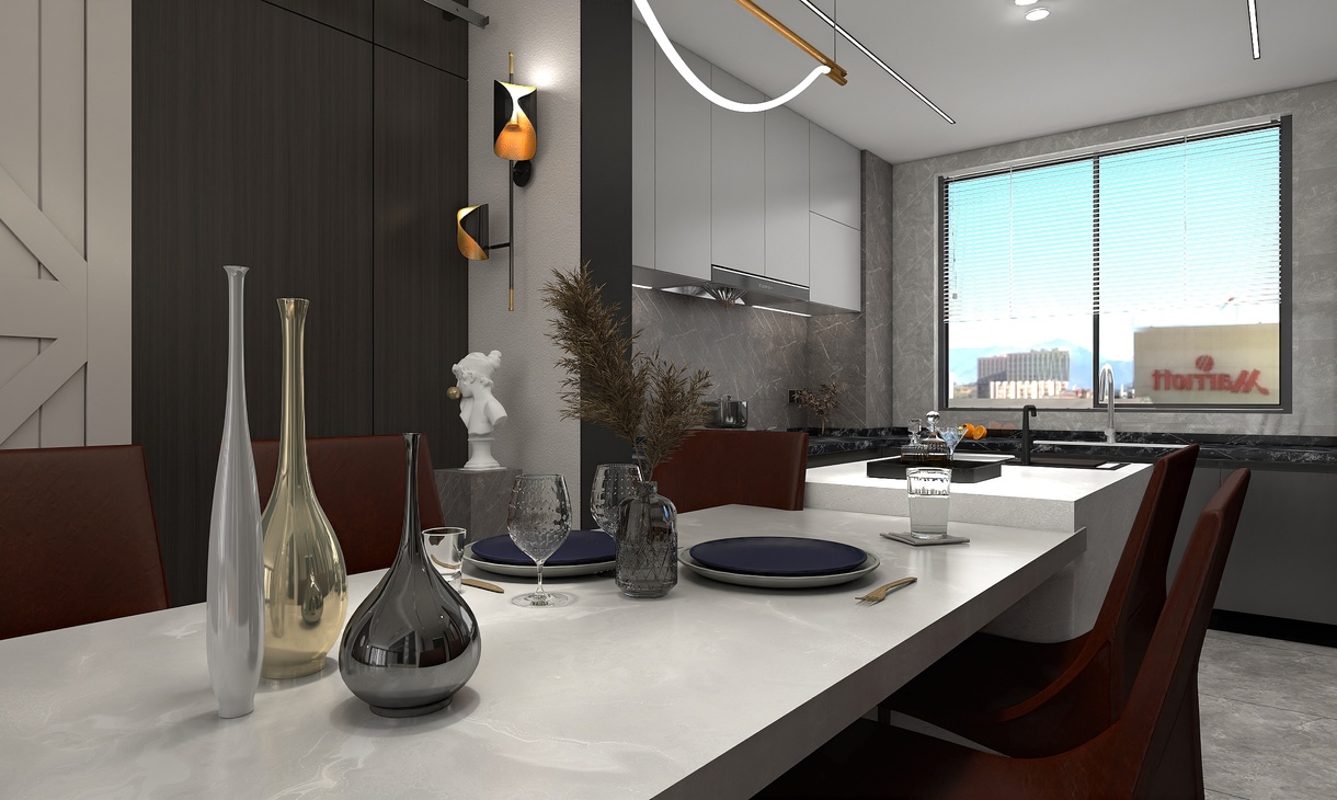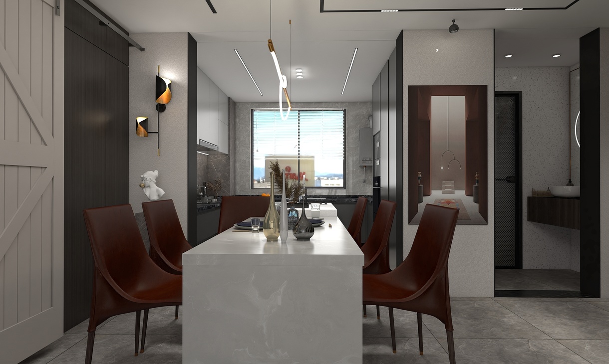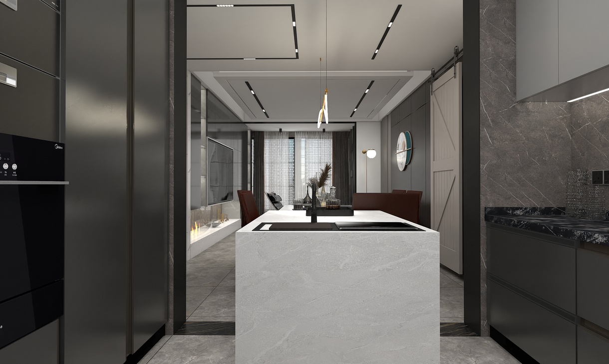 莫蘭迪色廚房 設(shè)計(jì)跳脫出了固有化、標(biāo)準(zhǔn)化的藩籬,將西廚島臺(tái)和餐桌結(jié)合,疊加餐廳的使用功能。時(shí)尚感
