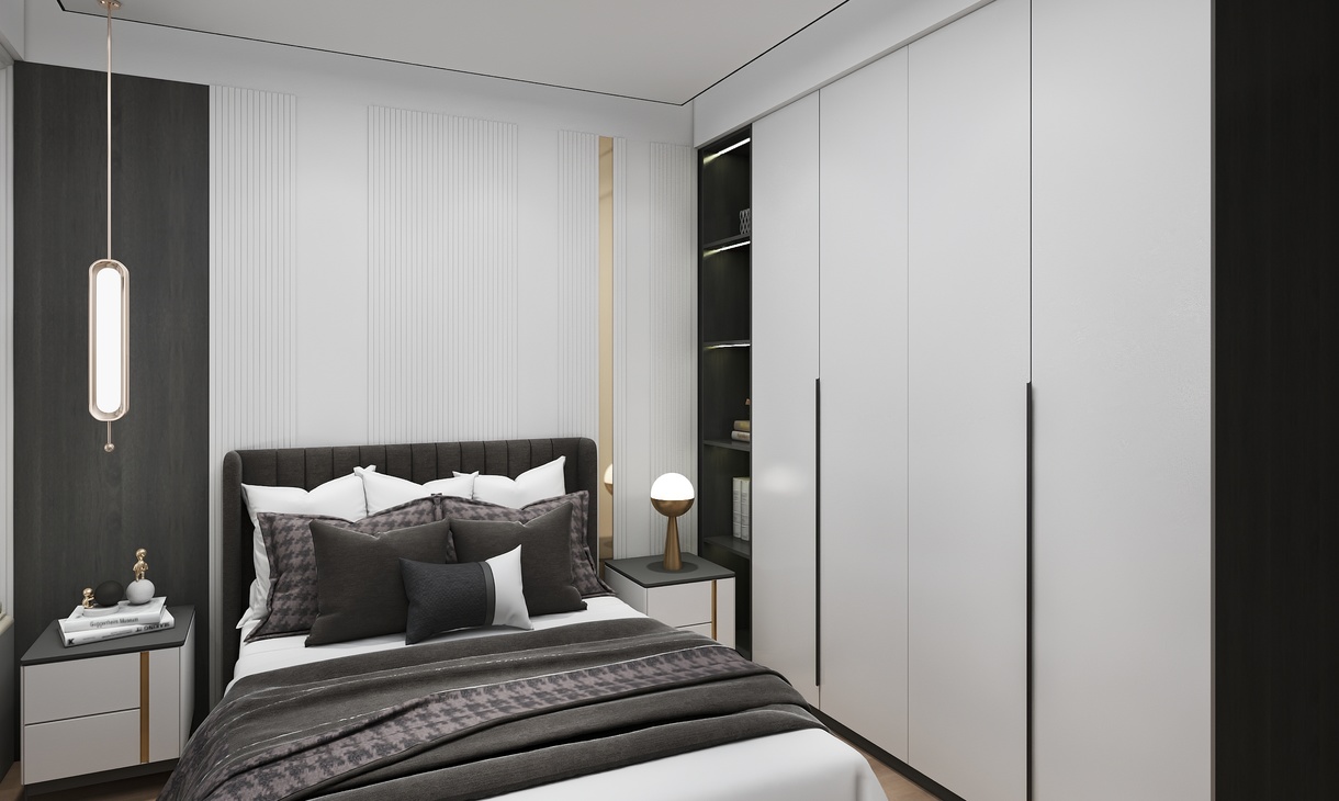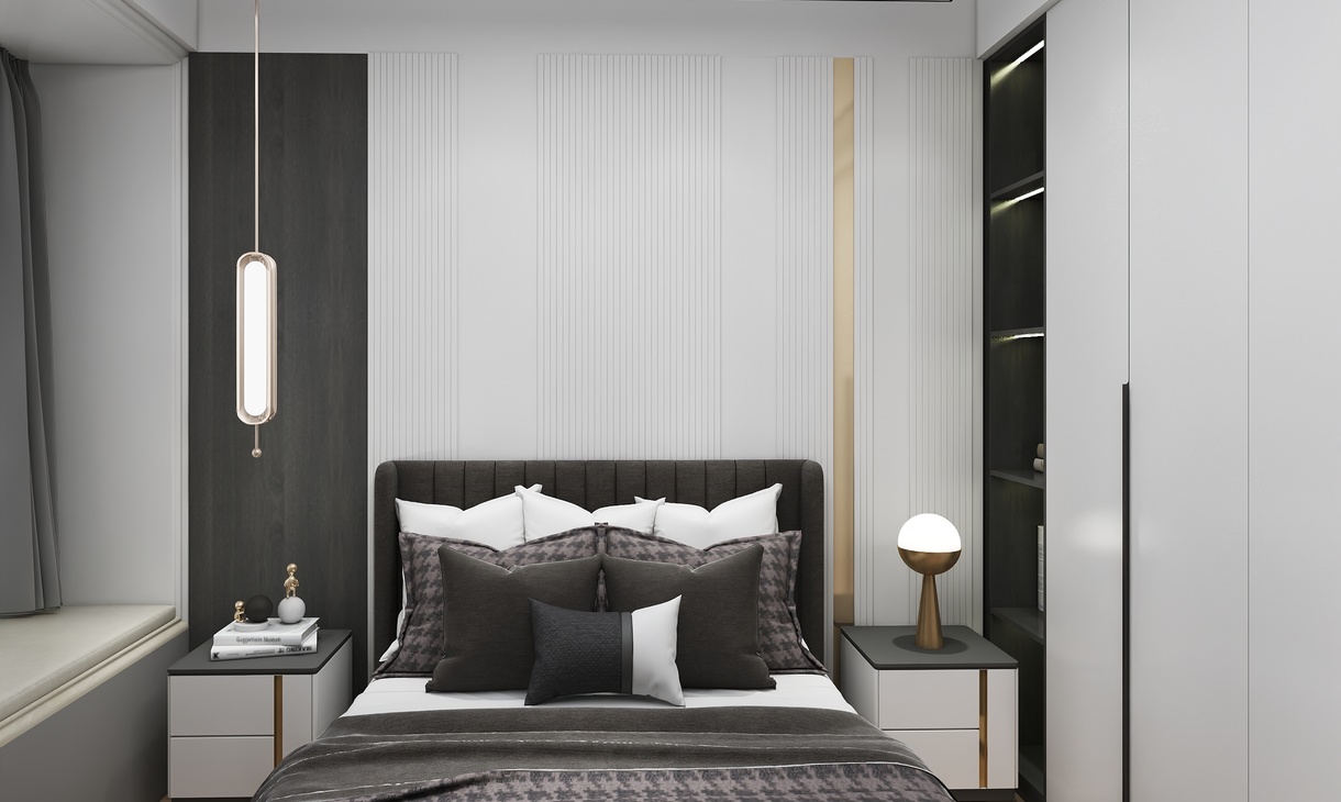 臥室以黑白色作為空間的主色調(diào),再加上一點(diǎn)點(diǎn)金色元素,營造出一種靜謐舒緩的氛圍。
