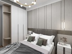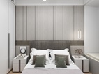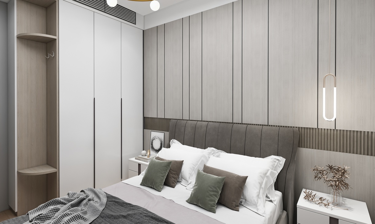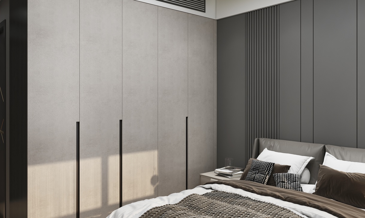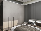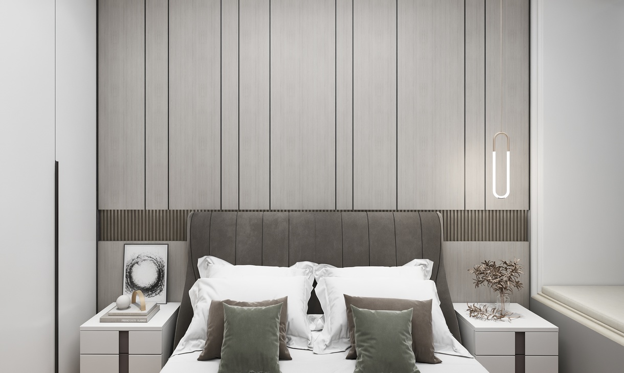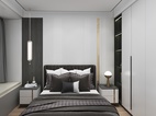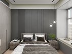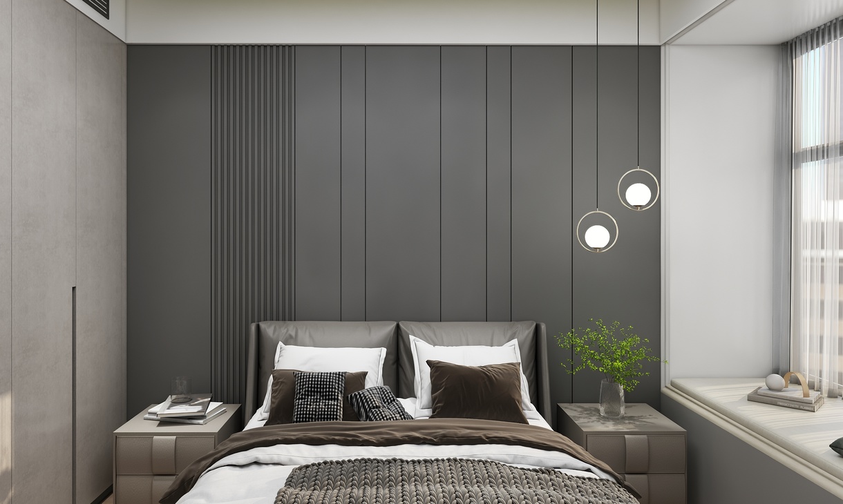 臥室在空間整體風(fēng)格為現(xiàn)代簡約風(fēng),主要以淺灰色調(diào)和深灰色為跳色。