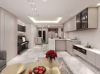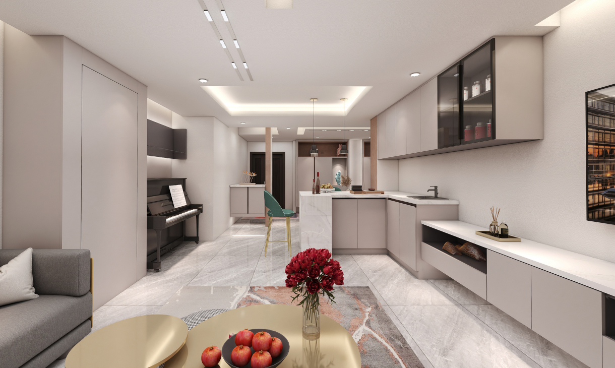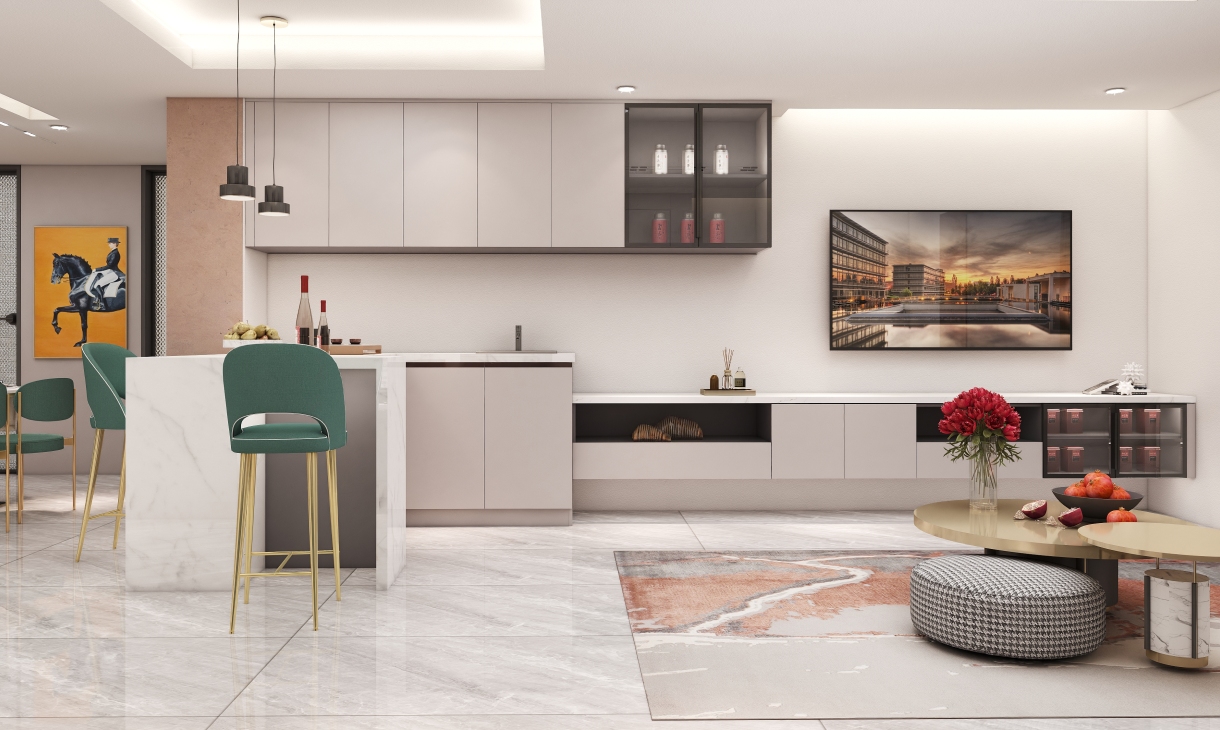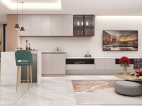 顏色延續(xù)了客廳的淺色,柜體采用木紋深色,搭配深色拉手營(yíng)造線的呈現(xiàn)