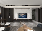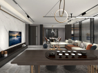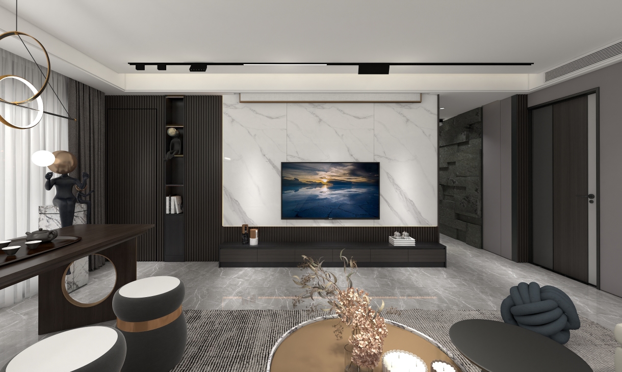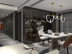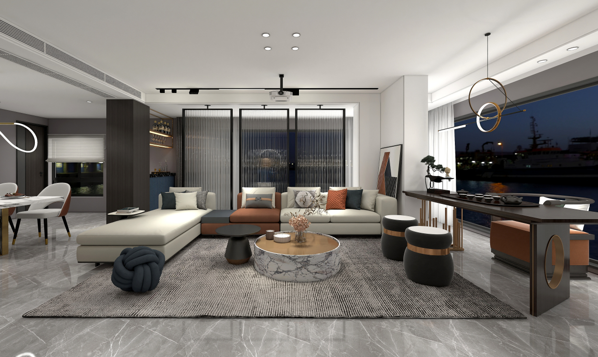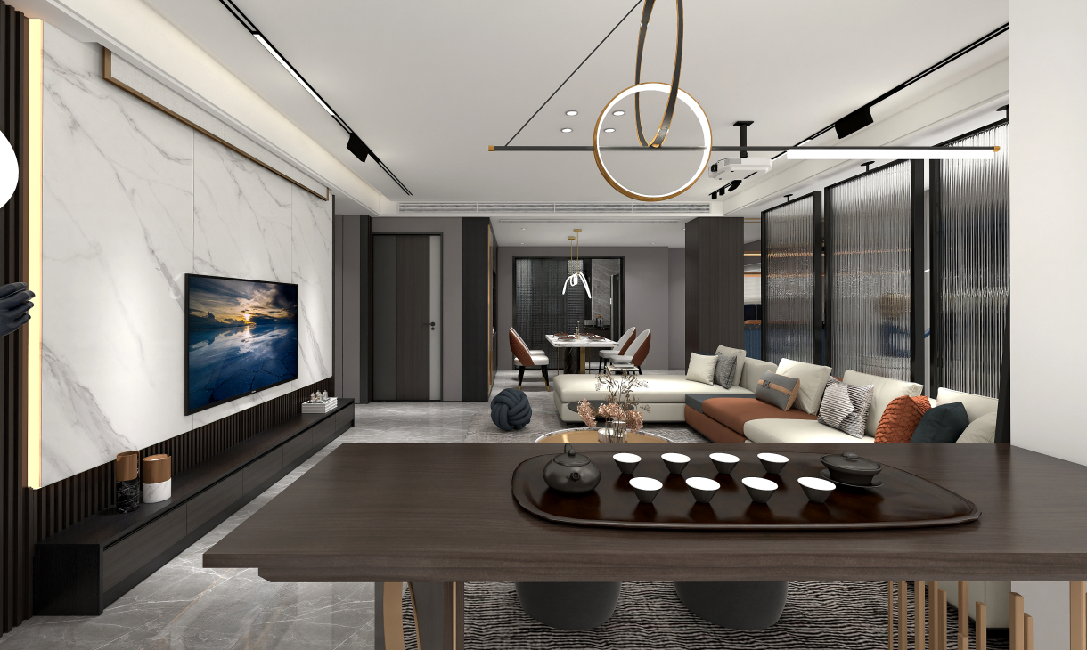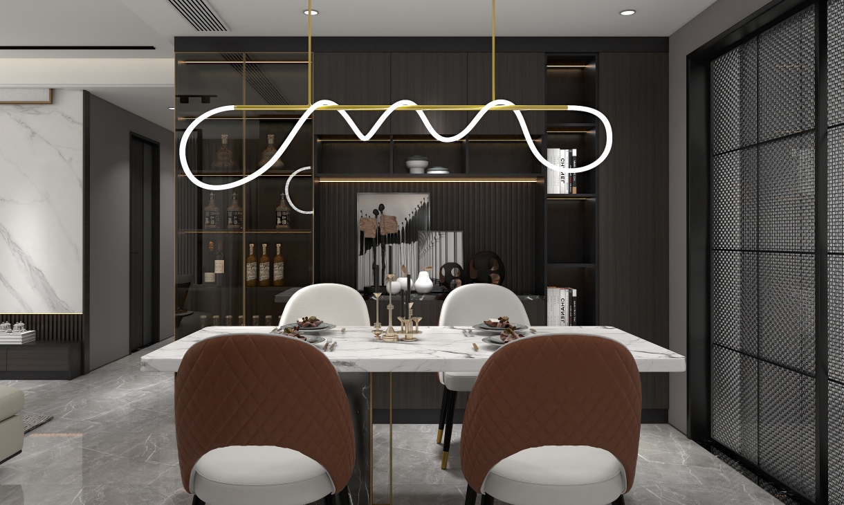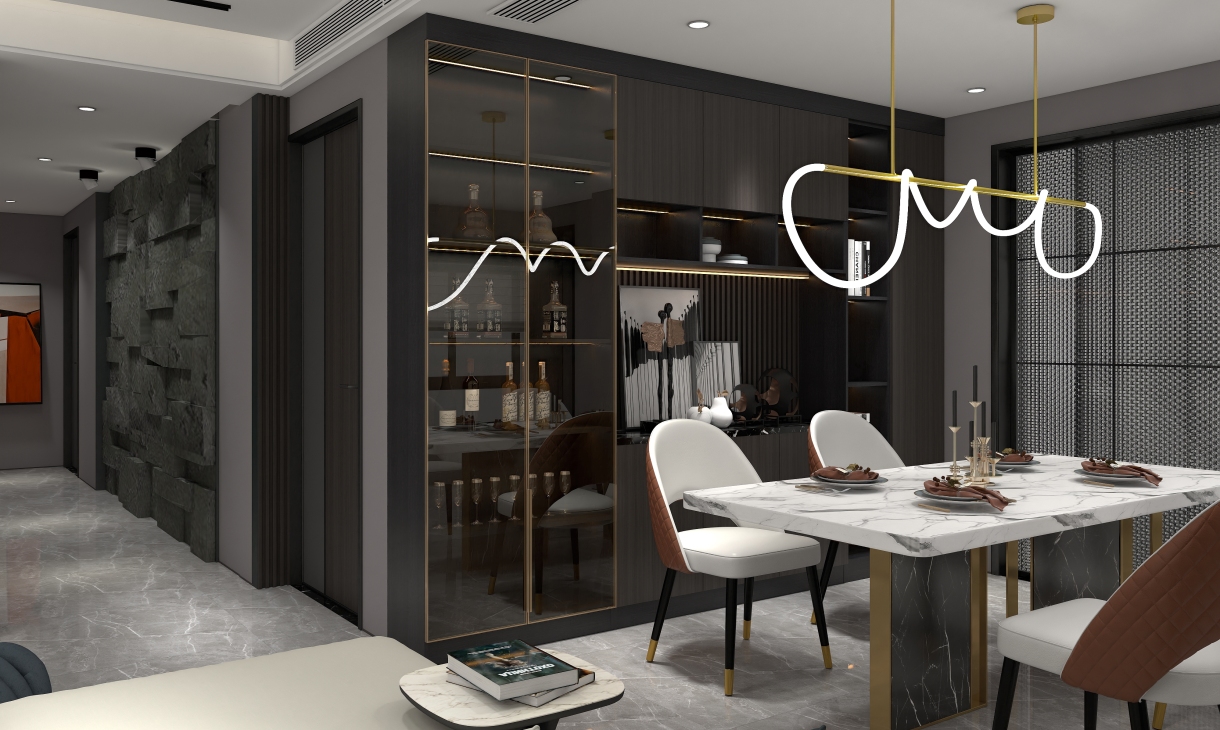 客餐廳構造上采用大平層吊頂和整體背景墻搭配,彰顯簡潔大氣的氛圍;材質上用了深色主材搭配鋁框玻璃門及琉璃屏風,在低調的裝潢中透露著小奢的氣息;在這沉穩(wěn)的氛圍中,橙藍軟飾搭配尤顯鮮明,恰到好處