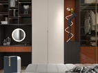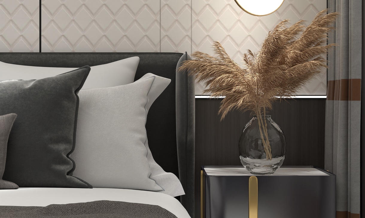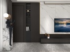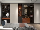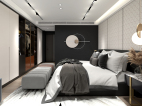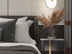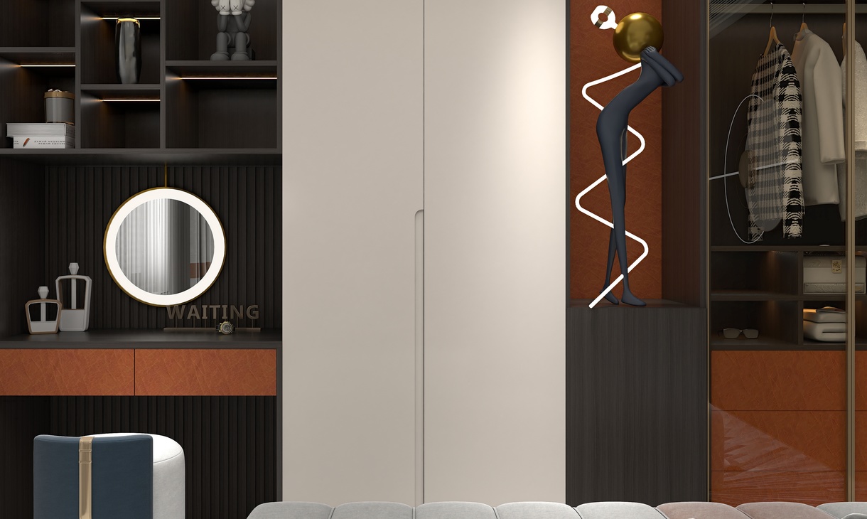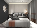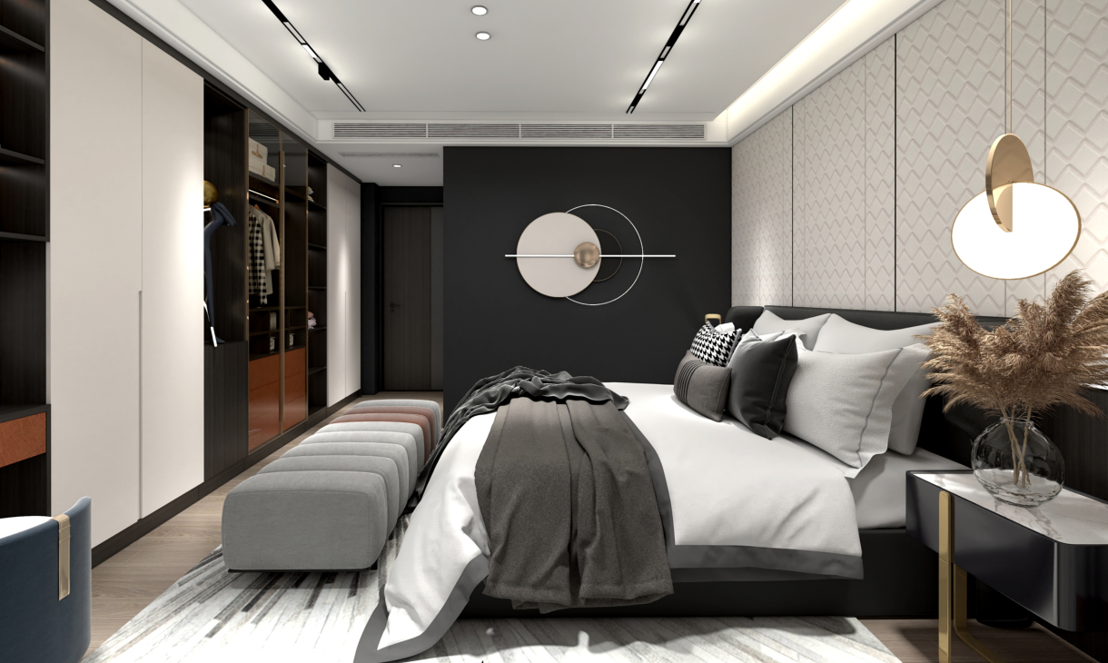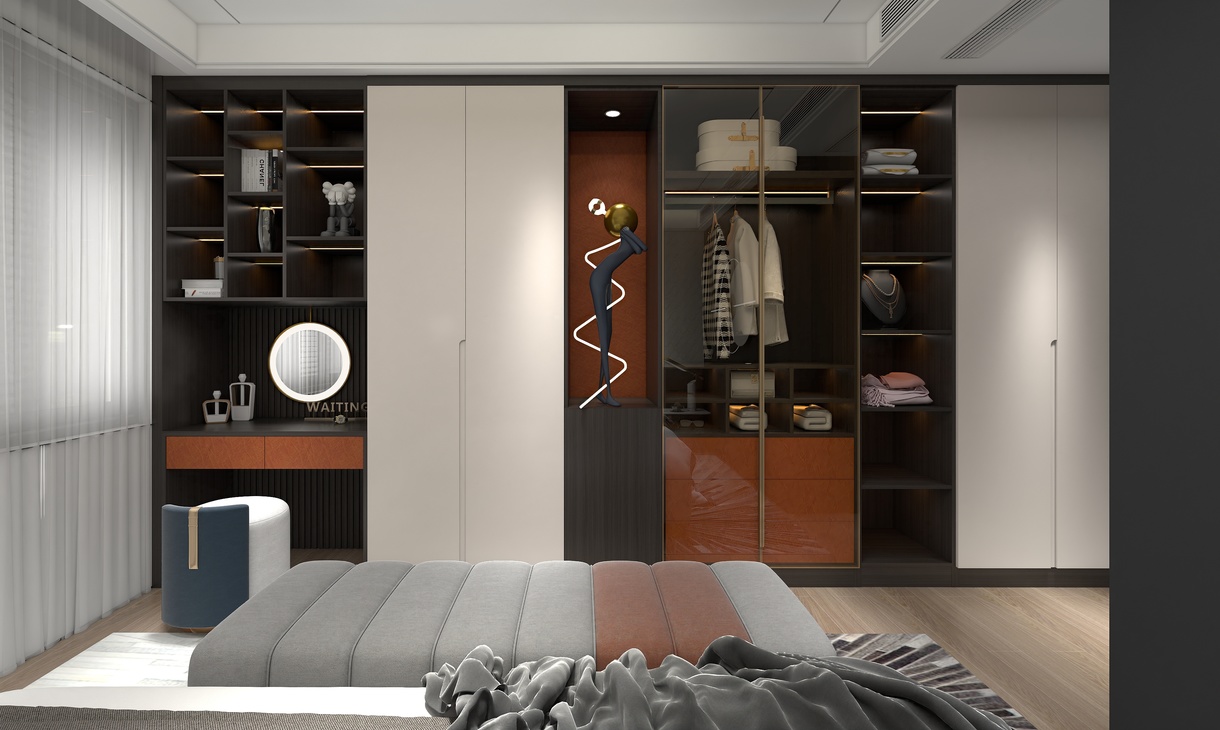 主臥同樣采用簡潔的平層吊頂,在深色墻面的搭配下,床頭背景尤顯C位;整墻的柜體,儲物上滿足的同時,又滿足了展示和功能上不將就的細致;皮紋橙材質的點綴和軟裝的呼應,相輔相成