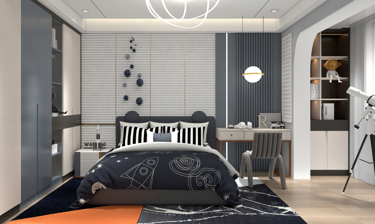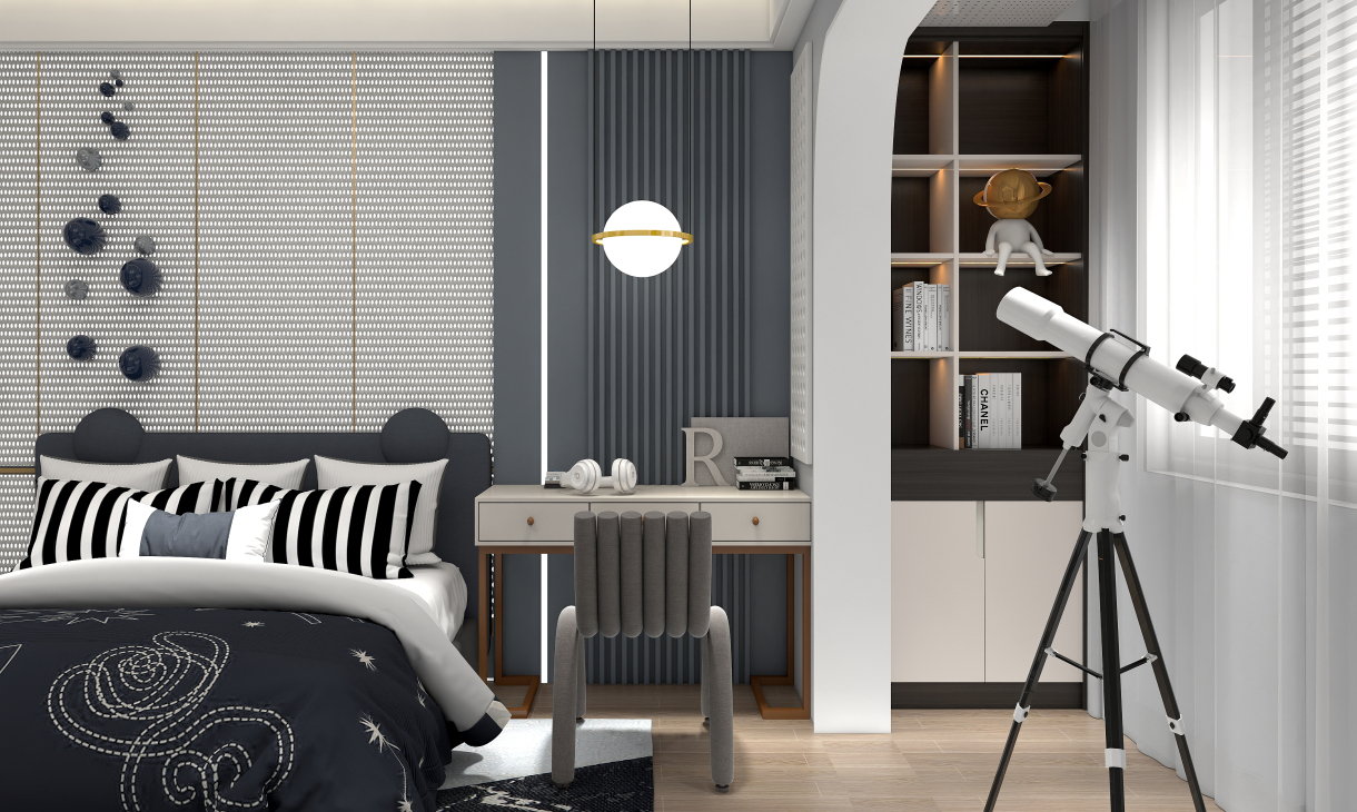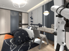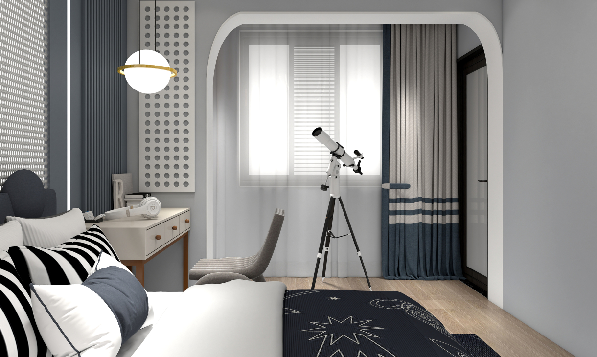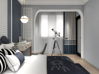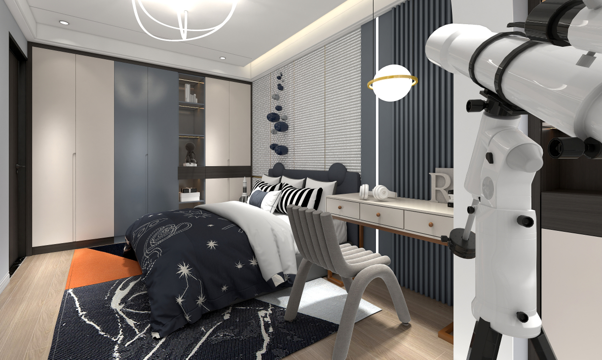 “小小宇航員的孵化基地”整體圍繞航空為主題,背景采用繁星點點的裝飾墻作為夢想啟蒙,藍色象征天空,在加上各式擺件燈飾,小男孩俏皮的夢想再也按捺不住了,總有進入夢鄉(xiāng)即是宇宙的感覺,也算是夢想的小搖籃吧