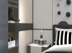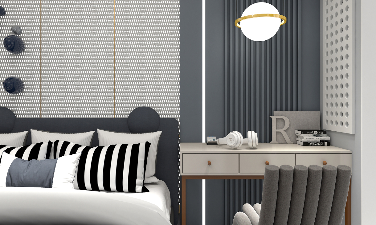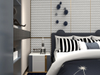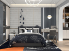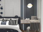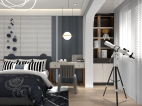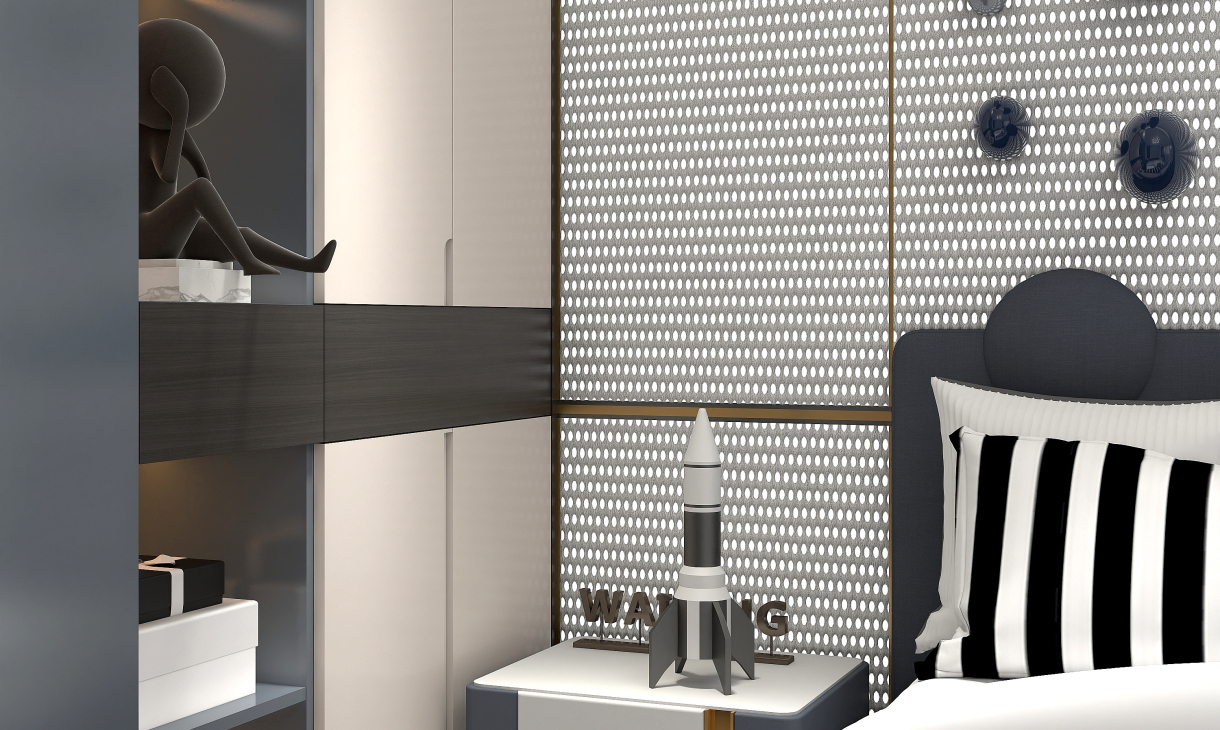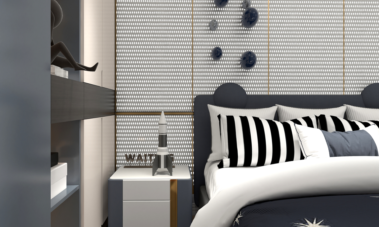 “小小宇航員的孵化基地”整體圍繞航空為主題,背景采用繁星點點的裝飾墻作為夢想啟蒙,藍色象征天空,在加上各式擺件燈飾,小男孩俏皮的夢想再也按捺不住了,總有進入夢鄉(xiāng)即是宇宙的感覺,也算是夢想的小搖籃吧