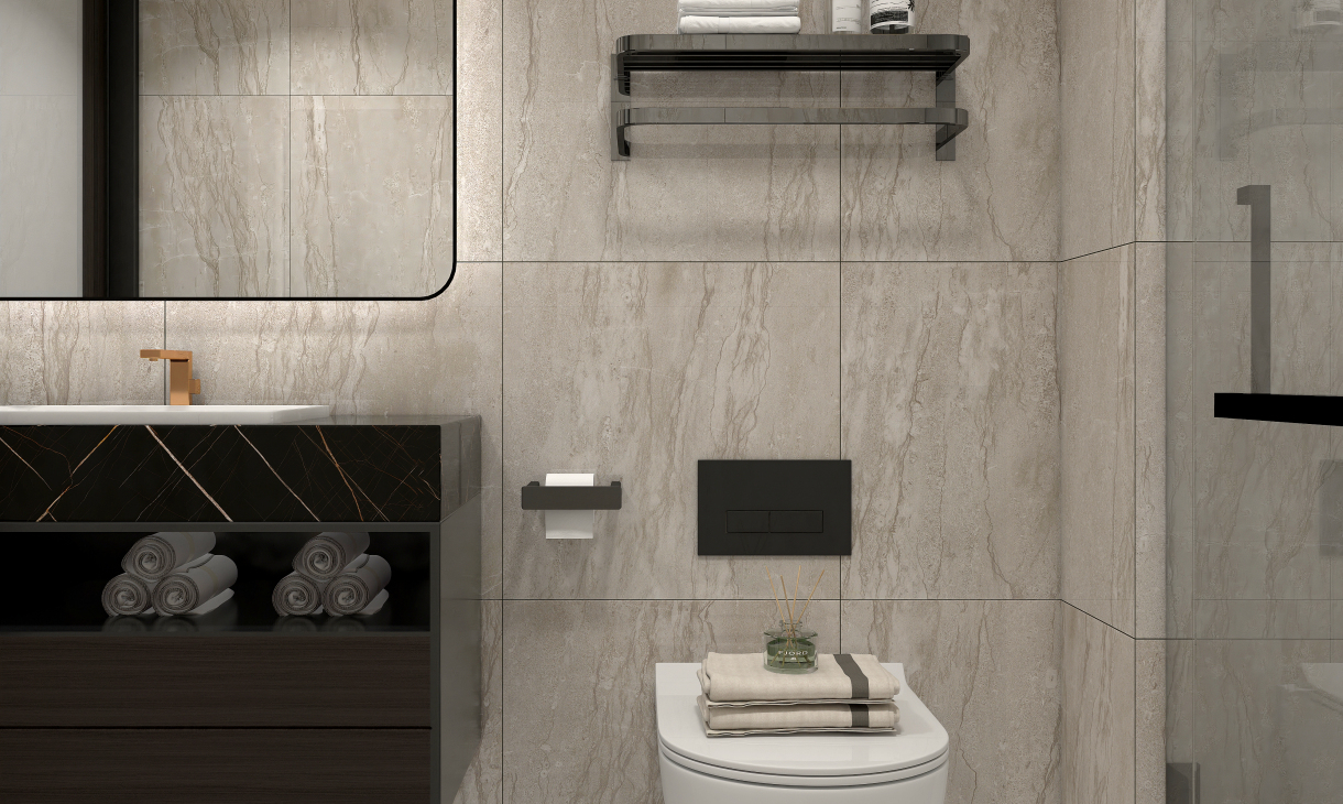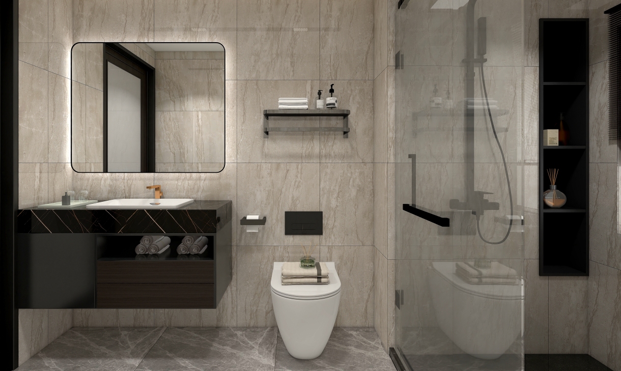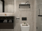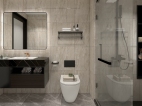 衛(wèi)生間采用黑灰搭配暖系墻面,沉穩(wěn)冰冷中夾著一絲溫存,簡潔而不失禮節(jié)