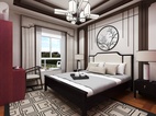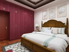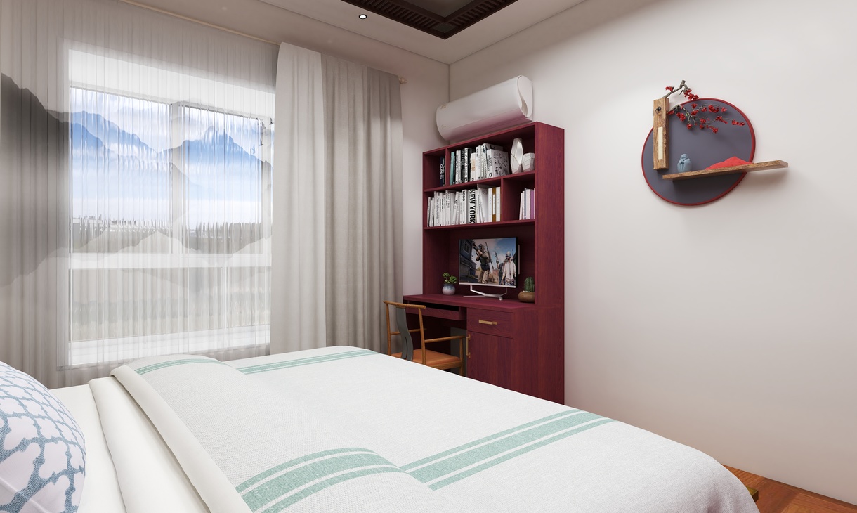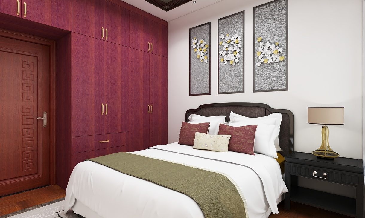 中式風(fēng)格,衣柜見光面設(shè)計為一個圓角,可以放飾品包包帽子,靈活性更高,正面兩個掛衣鉤可以把日常包包圍巾帽子掛上面,既裝飾又使用,同時也點綴了整個空面,臥室一角一個書桌辦公用。
