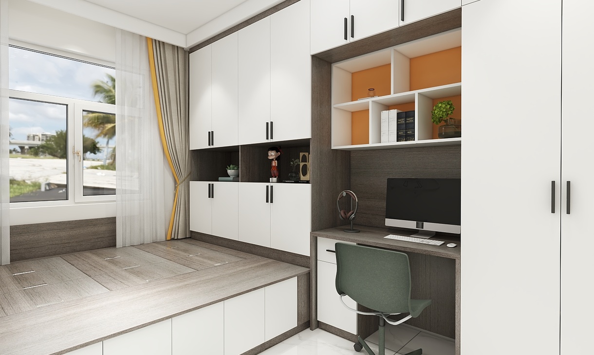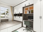 榻榻米功能房設(shè)計具備衣柜、床、學習等多個區(qū)域的設(shè)計。